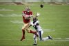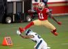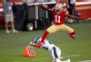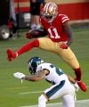 SANTA CLARA, CALIFORNIA - OCTOBER 04: Brandon Aiyuk #11 of the San Francisco 49ers leaps over Marcus Epps #22 of the Philadelphia Eagles to score a touchdown during the first quarter at Levi's Stadium on October 04, 2020 in Santa Clara, California. (Photo by Ezra Shaw/Getty Images) *** BESTPIX ***