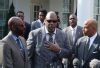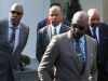 WASHINGTON, DC - FEBRUARY 18: (L-R) Former NFL players Ronnie Lott, Charles Haley, Jim Brown and Jerry Rice step out of the West Wing to speak about the presidential pardon of Edward DeBartolo Jr. at the White House on February 18, 2020 in Washington, DC. In 1998 DeBartolo Jr. pleaded guilty to fraud after paying $400,000 for a riverboat gambling licence. (Photo by Mark Wilson/Getty Images)