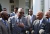 WASHINGTON, DC - FEBRUARY 18: (L-R) Former NFL players Charles Haley, Ronnie Lott, Jerry Rice and Jim Brown speak about the presidential pardon of Edward DeBartolo Jr. at the White House on February 18, 2020 in Washington, DC. In 1998 DeBartolo Jr. pleaded guilty to fraud after paying $400,000 for a riverboat gambling licence. (Photo by Mark Wilson/Getty Images)