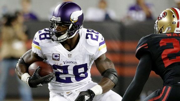 Peterson acarreó el balón sólo cuatro veces para 14 yardas en la primera mitad, perdiéndose las últimas dos series del segundo cuarto, con Jerick McKinnon y Matt Asiata tomando su lugar. Peterson registró un acarreo de nueve yardas en la primera serie de los Vikings en el tercer cuarto, resultó ser su acarreo más largo de la noche.